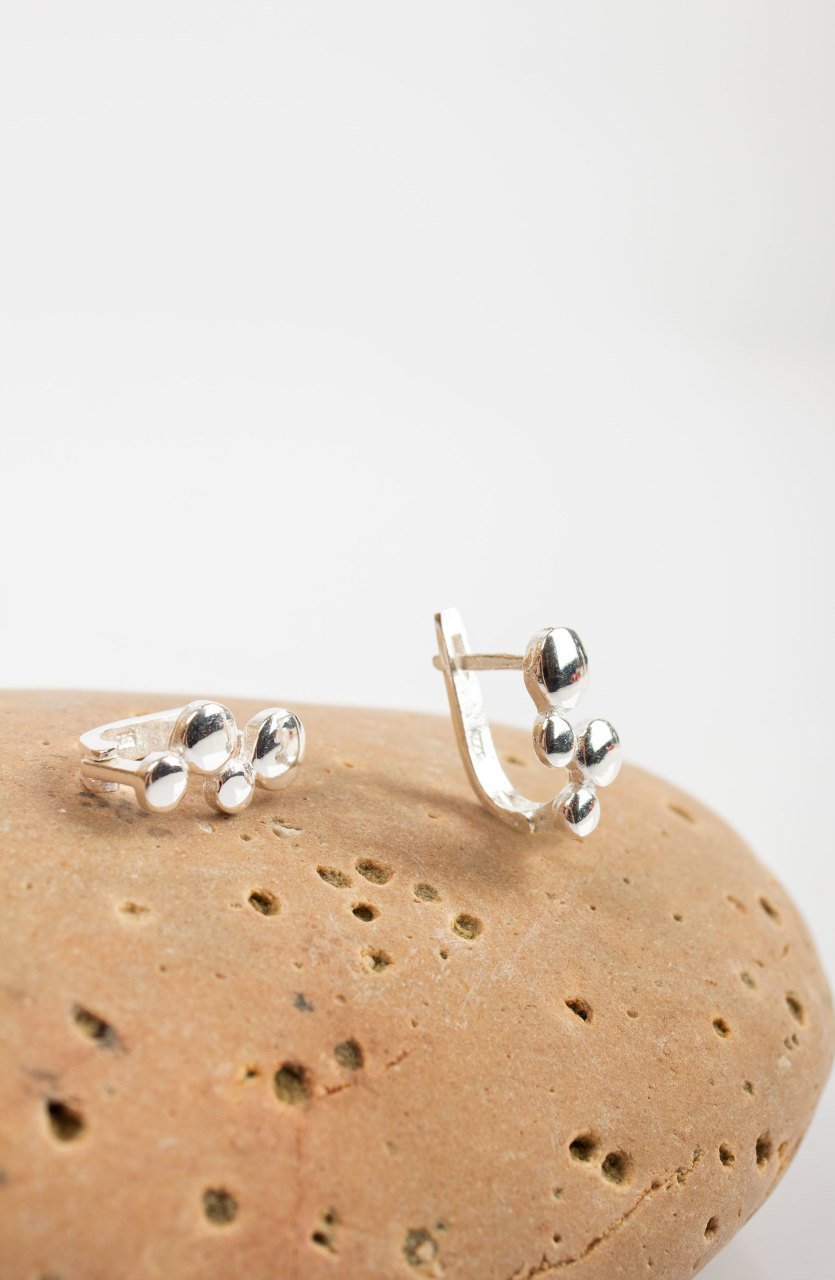 2 cm long earrings are formed with small and large half domes, grouped on the front side. 925 sterling silver.